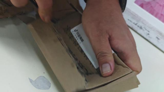 现场声 新闻频道记者 现在我们找到了一个纸壳,我们看一下这个刀的刀尖到底锋不锋利,我们可以用比较轻微的力气,进行一个刺穿,很轻易地就可以把纸壳给穿透。